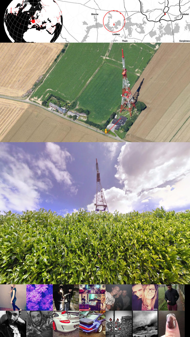A Network of Fragments is an instrument who aims to make visible local fragments of various networks used for High Frequency Trading. These fragments, high masts covered with “dishes”, are represented through a superposition of various sources. Maps, Google’s satellite image, Street Views, and Instagram pictures allow us to see the superposition of the High Frequency Trading network with the local and daily activities of the population living around these antennas. The coordinates of this network were gathered by the anthropologist Alexandre Laumonier.